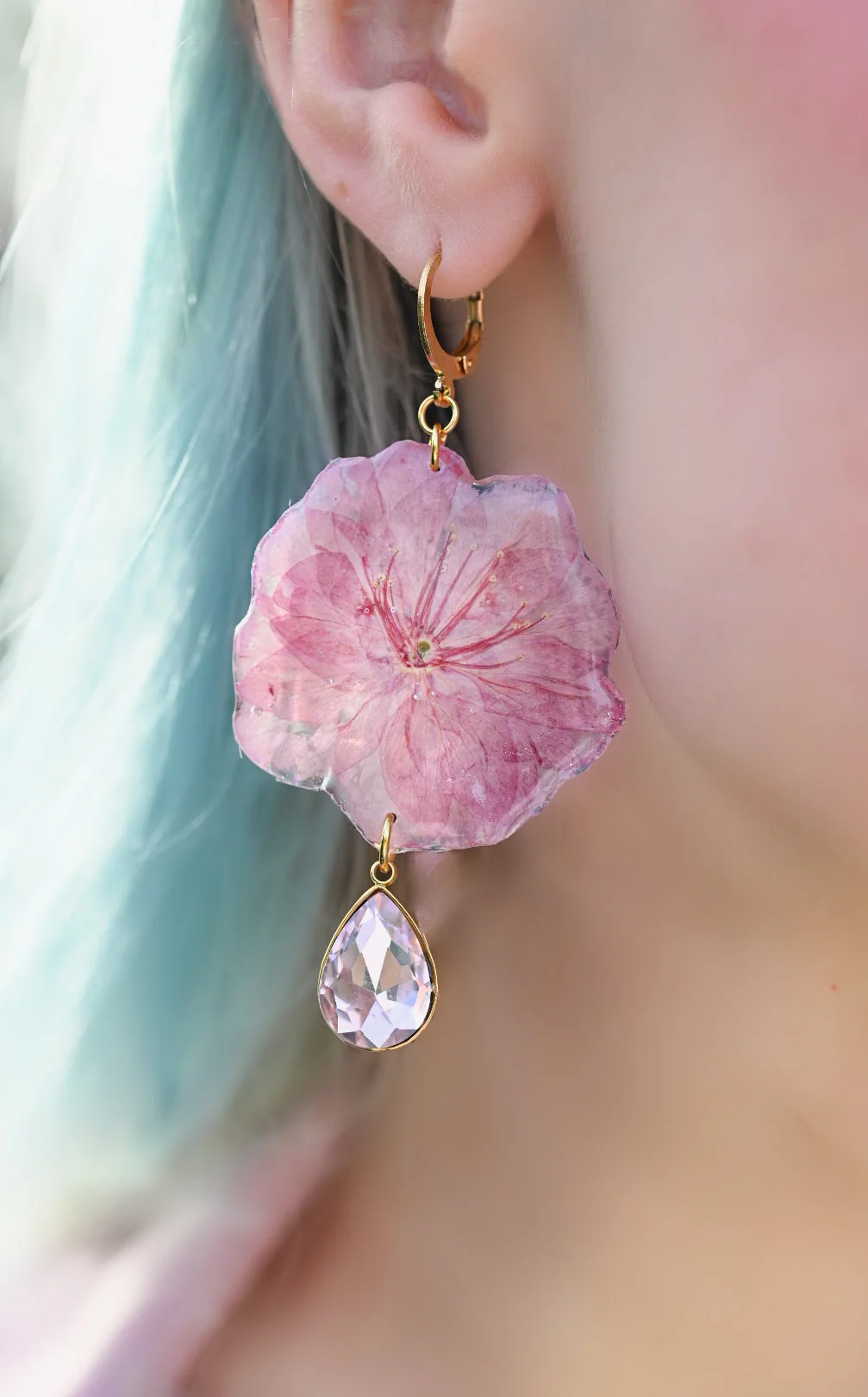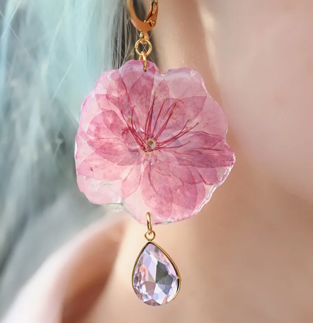 Delikatne, długie kolczyki wykonane ręcznie z zatopionym prawdziwym kwiatem wiśni i różowym kryształem.