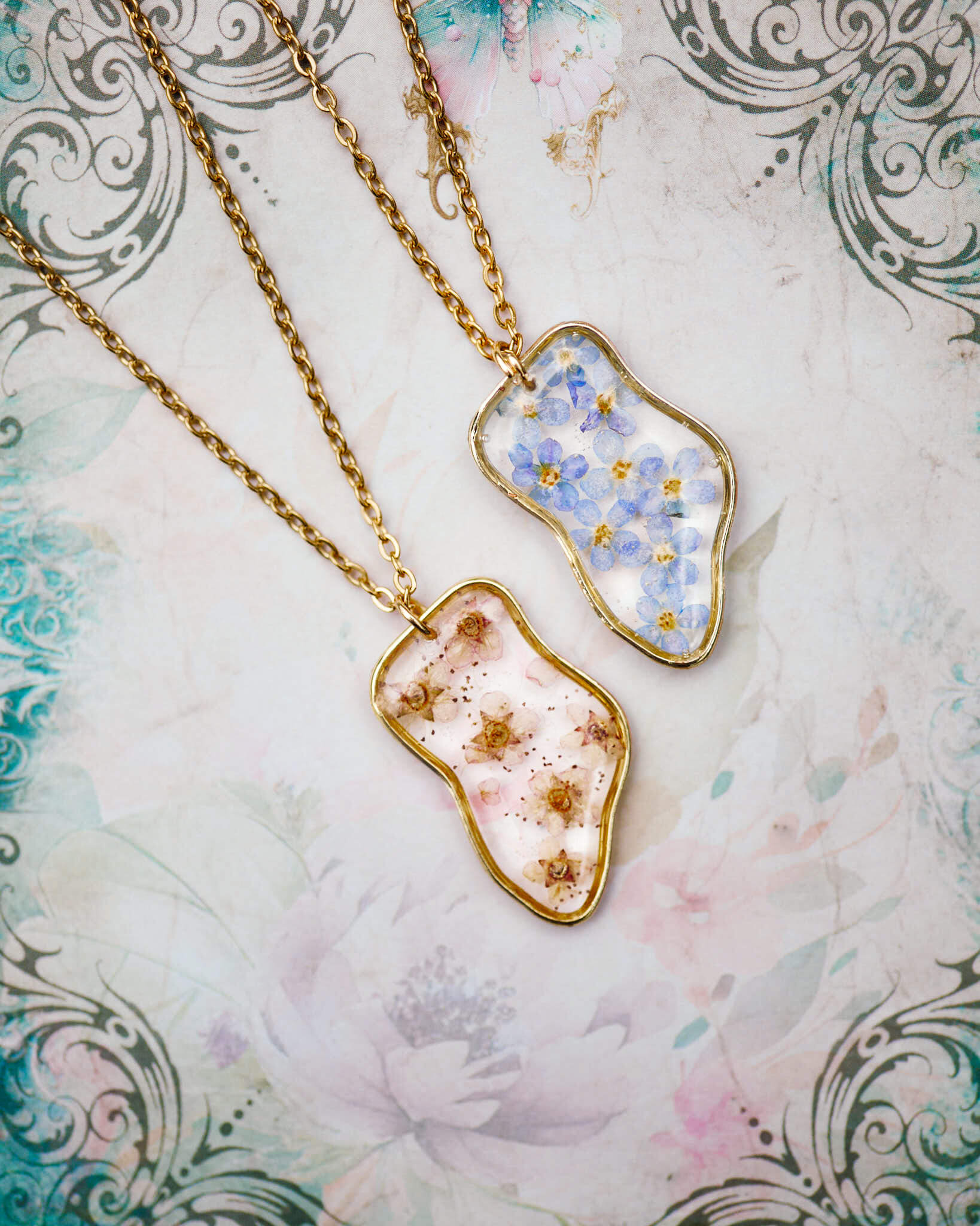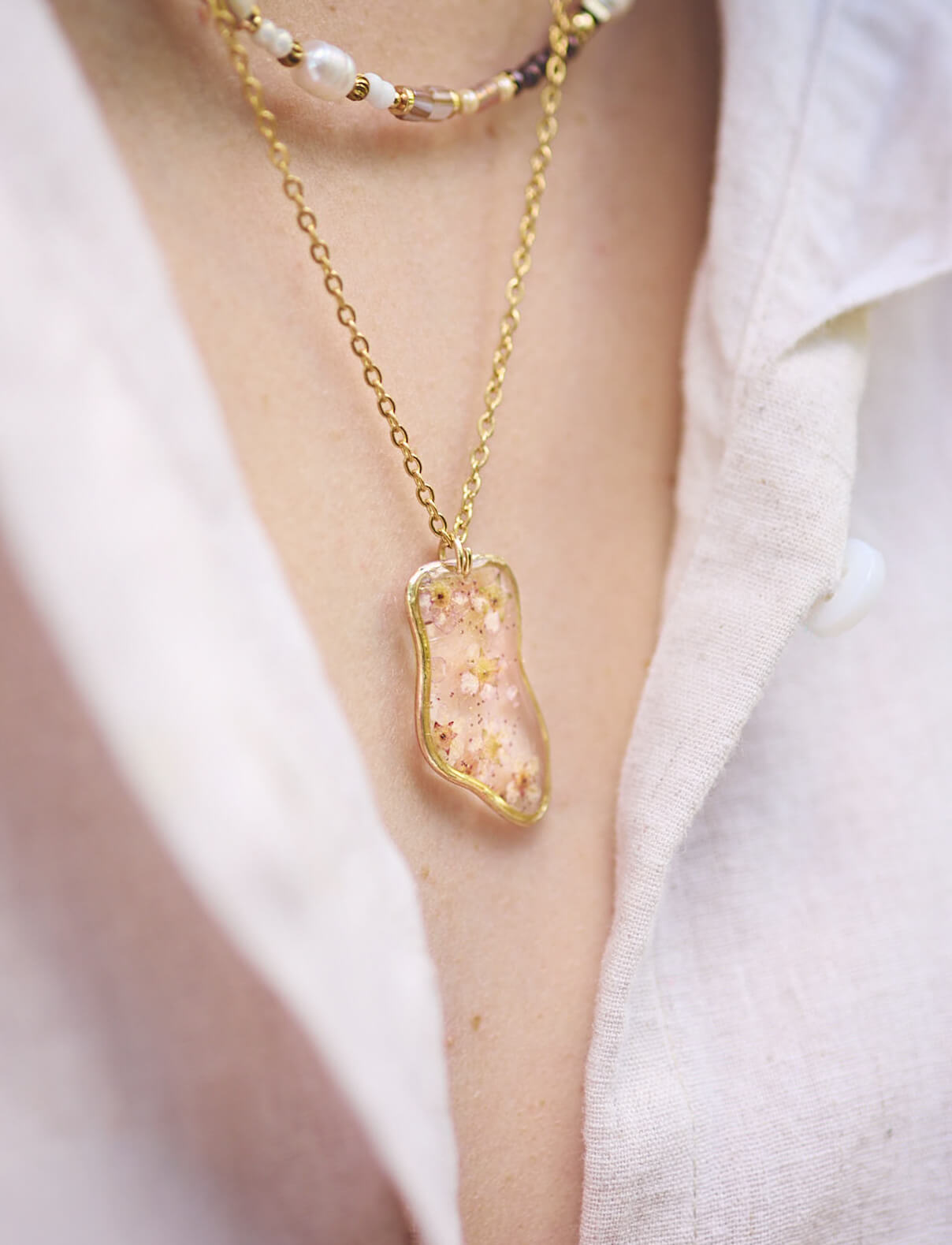 Ten naszyjnik to idealny wybór dla osób, które kochają handmade dodatki, naturalne motywy i elegancję w eterycznym stylu. Dzięki nieregularnym kształtom kwiatów każdy egzemplarz jest niepowtarzalny.