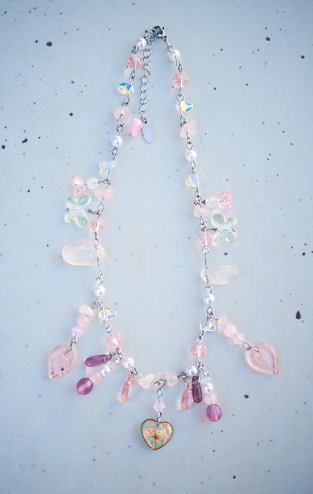 Naszyjnik został wykonany ze szklanych koralików i charmsów o lekkim, migoczącym wykończeniu. Całość dopełnia opalizujące serduszko z zatopionym różowym kwiatem tawuły japońskiej — maleńkim talizmanem natury, który dodaje naszyjnikowi wyjątkowego charakteru. U końca znajdziesz także subtelny charms z logo marki, dzięki któremu kolia zyskuje eleganckie wykończenie.